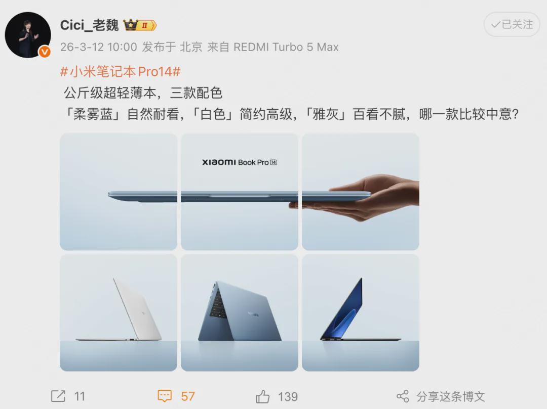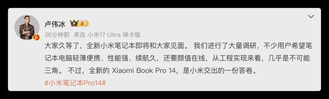 目标是像打造小米汽车一样,为用户带来一款高品质、高颜值、高性能的旗舰笔记本。